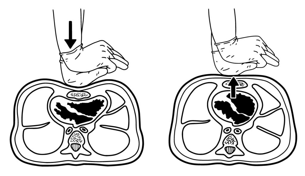 - Θωρακικές συμπιέσεις: Χρησιμοποιούμε το βάρος του σώματός μας, κλειδώνοντας τους αγκώνες μας τεντωμένους (για να κουραστούμε όσο το δυνατόν λιγότερο) και πιέζουμε τον θώρακα σε βάθος περίπου 5 με 6 εκατοστά. Οι θωρακικές συμπιέσεις πρέπει να γίνονται σε συχνότητα 100 με 120 φορές το λεπτό. Το κομμάτι «Staying Alive» των Bee Gees έχει τέμπο 104 BPM και συχνά προτείνεται ως τρόπος να βρεις τον σωστό ρυθμό.