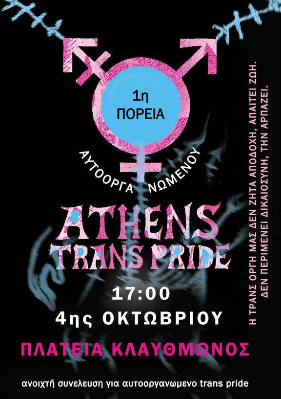 Σάββατο 4 Οκτώβρη, στις 5μμ στη Κλαυθμώνος στηρίζουμε την πρώτη πορεία του αυτοοργανωμένο trans pride